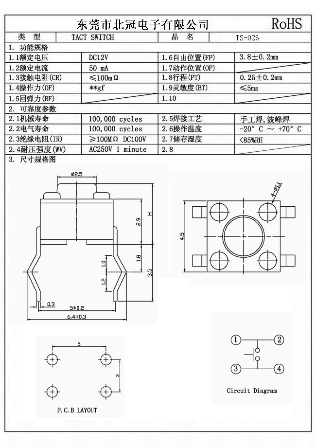 產品名稱:TS-026輕觸開關 Typical Specifications |