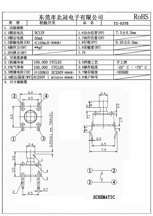 TS-037B是6*6*7.3輕觸開(kāi)關(guān),高度是固定的,按鍵頭尺寸是2.4*2.4,輕觸開(kāi)關(guān)按鍵力度有160g/250g四種。屬于環(huán)保輕觸開(kāi)關(guān)