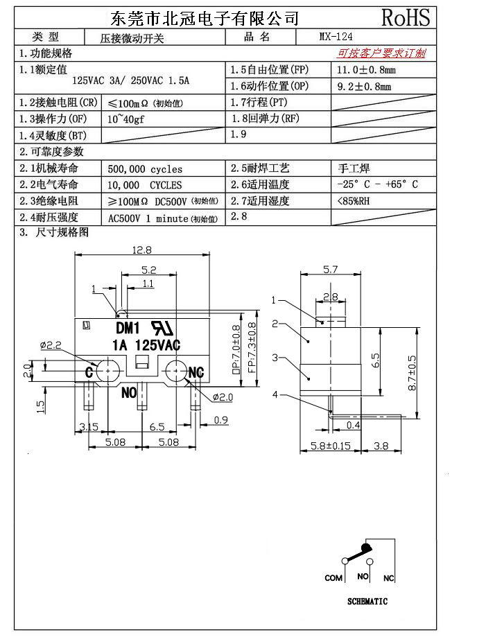 3.Lnsulation Resistance: ≥100mΩ DC500V
