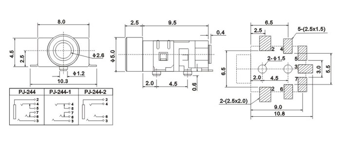品名:2.5耳機插座 耳機插座技術參數: 1.額定負荷:0.5A 30V DC 2.按觸電阻:100 mΩ max. 3.使用溫度:-20℃~70℃ 4.插拔力:3-20N 5.使用壽命:5,000cycles 耳機插座主要組成部件: 1.塑膠底座 2.磷銅或鈹銅簧片
