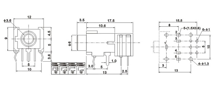 品名:3.5耳機插座 耳機插座技術參數: 1.額定負荷:0.5A 30V DC 2.按觸電阻:100 mΩ max. 3.使用溫度:-20℃~70℃ 4.插拔力:3-20N 5.使用壽命:5,000cycles 耳機插座主要組成部件: 1.塑膠底座 2.磷銅或鈹銅簧片