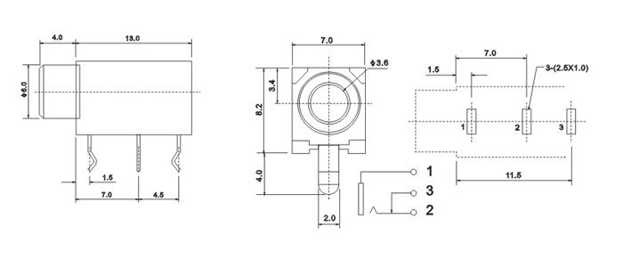 品名:3.5耳機插座 耳機插座技術參數: 1.額定負荷:0.5A 30V DC 2.按觸電阻:100 mΩ max. 3.使用溫度:-20℃~70℃ 4.插拔力:3-20N 5.使用壽命:5,000cycles 耳機插座主要組成部件: 1.塑膠底座 2.磷銅或鈹銅簧片