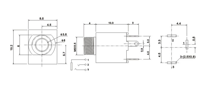 品名:3.5耳機插座 耳機插座技術參數: 1.額定負荷:0.5A 30V DC 2.按觸電阻:100 mΩ max. 3.使用溫度:-20℃~70℃ 4.插拔力:3-20N 5.使用壽命:5,000cycles 耳機插座主要組成部件: 1.塑膠底座 2.磷銅或鈹銅簧片